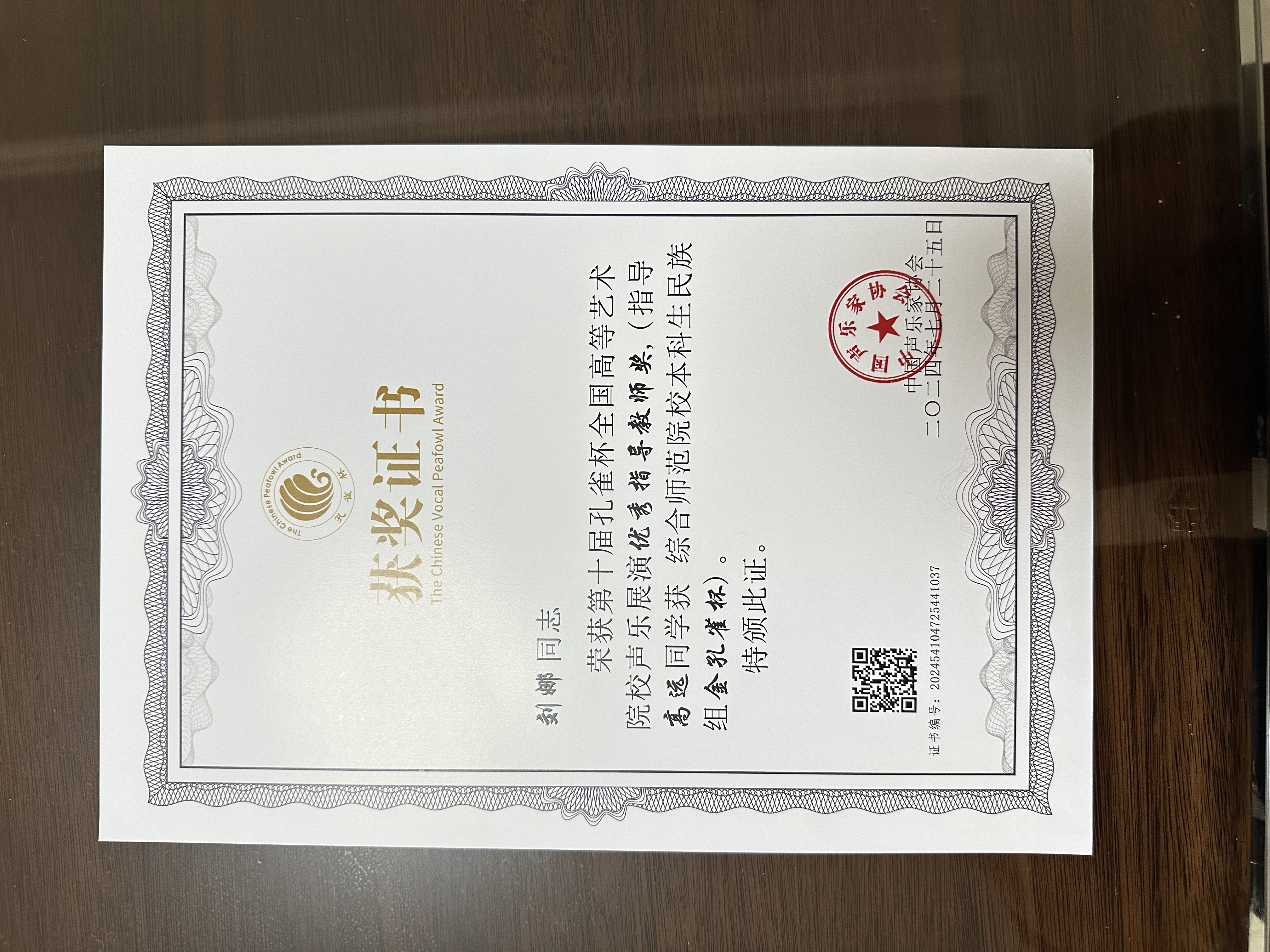 获奖名称:2024第十届孔雀杯全国高等艺术院校声乐展演