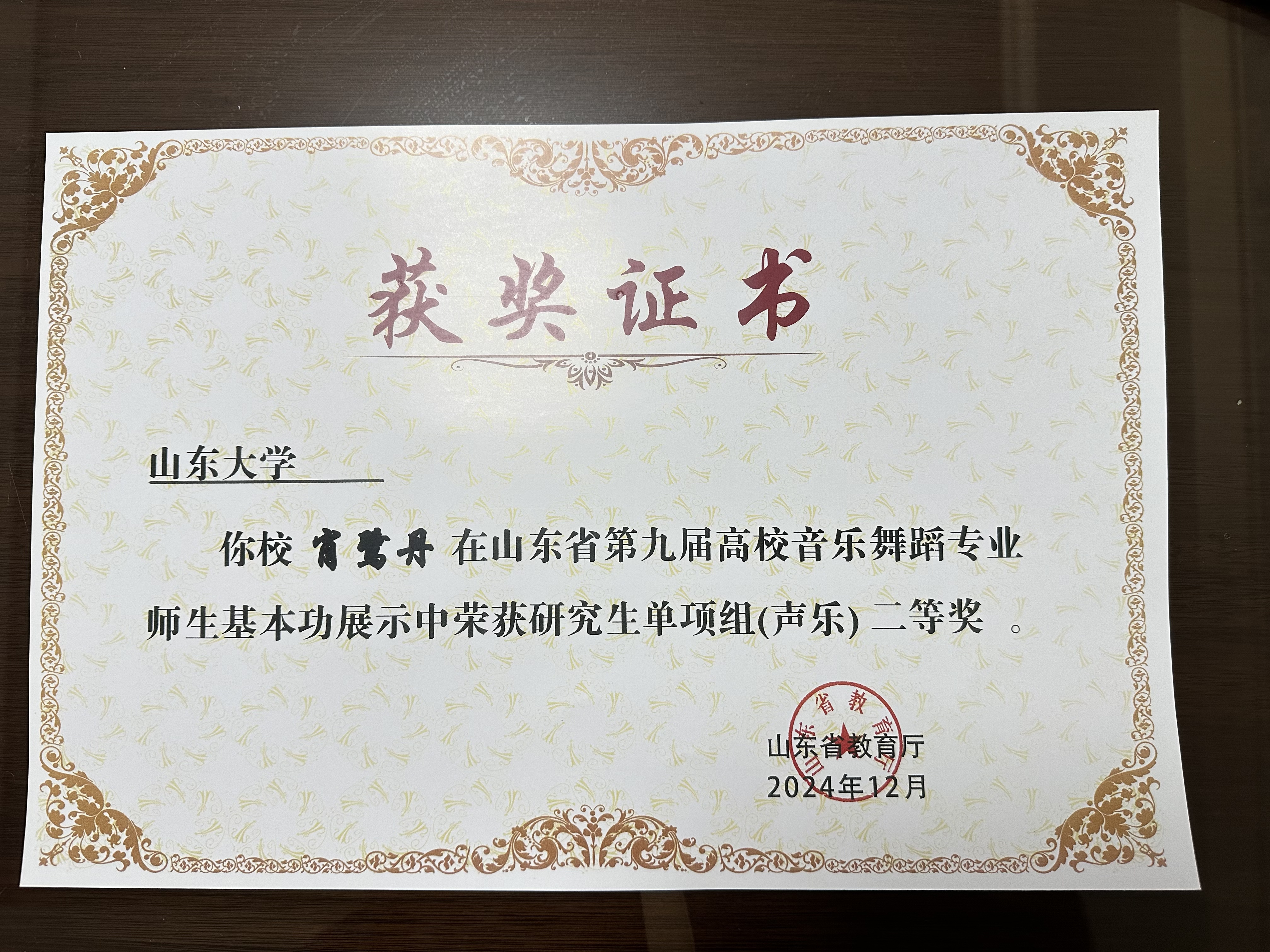 获奖名称:山东省第九届高校音乐舞蹈专业师生基本功展演