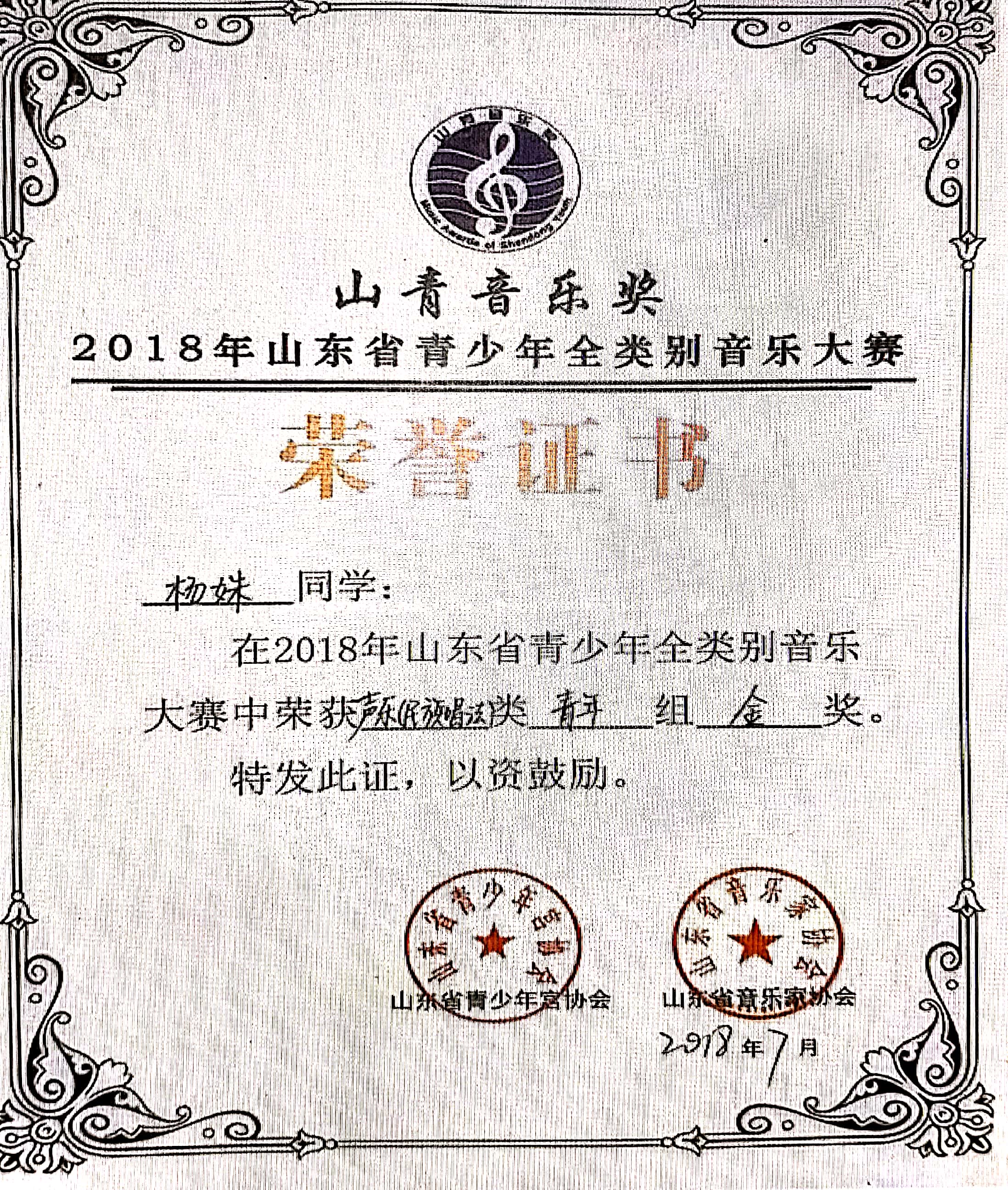 获奖名称:2018年山东省青少年全类别音乐大赛