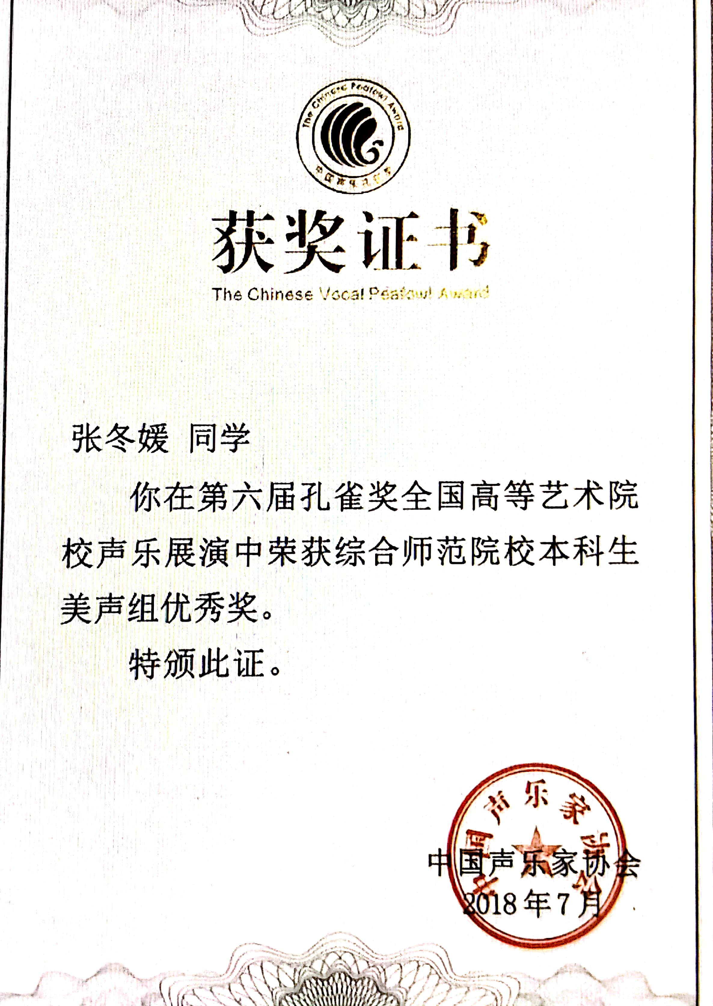 获奖名称:第六届孔雀奖全国高等艺术院校声乐展演