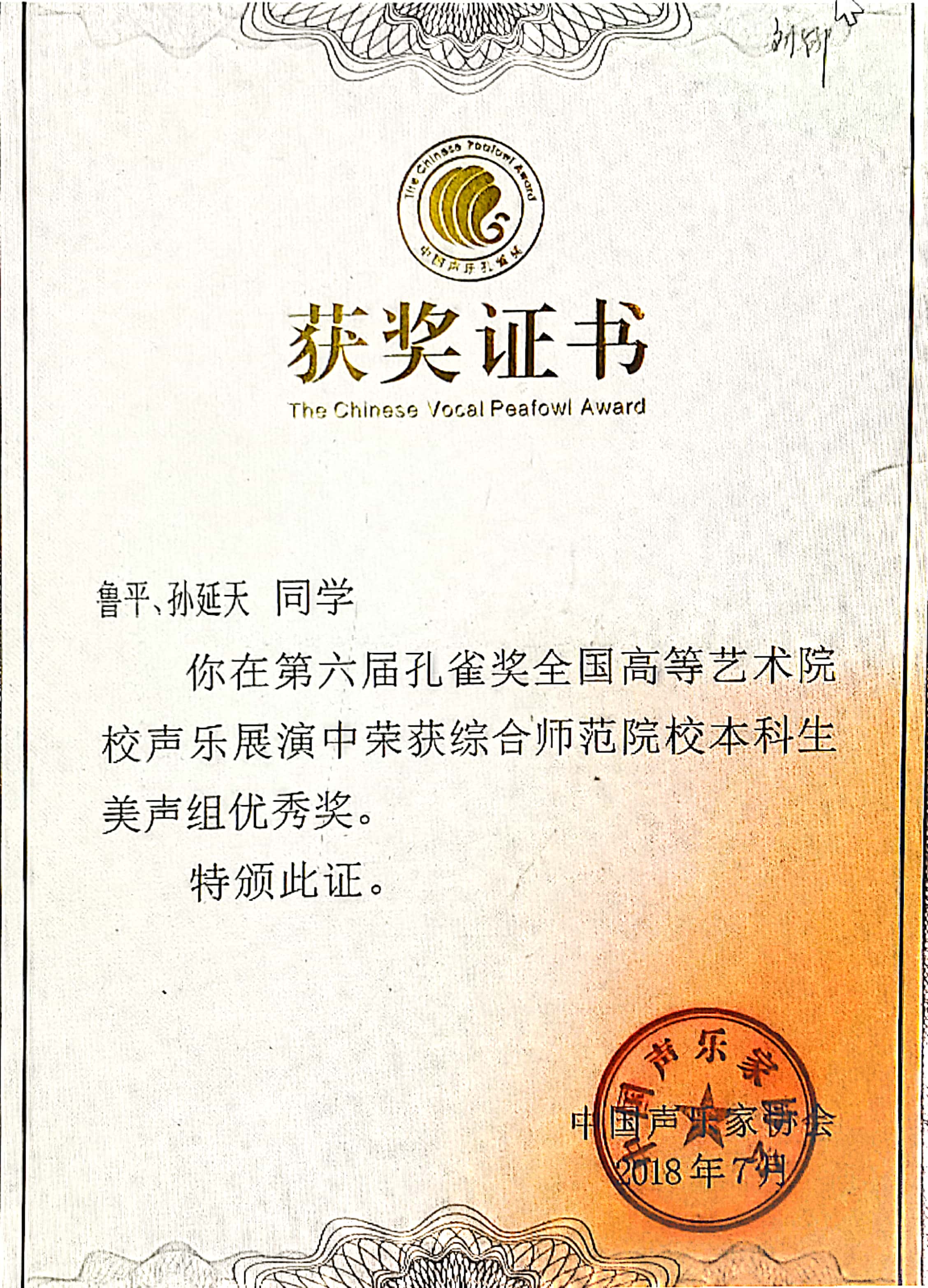 获奖名称:第六届孔雀奖全国高等艺术院校声乐展演