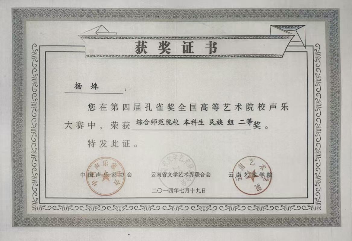 获奖名称:第六届孔雀奖全国高等艺术院校声乐展演