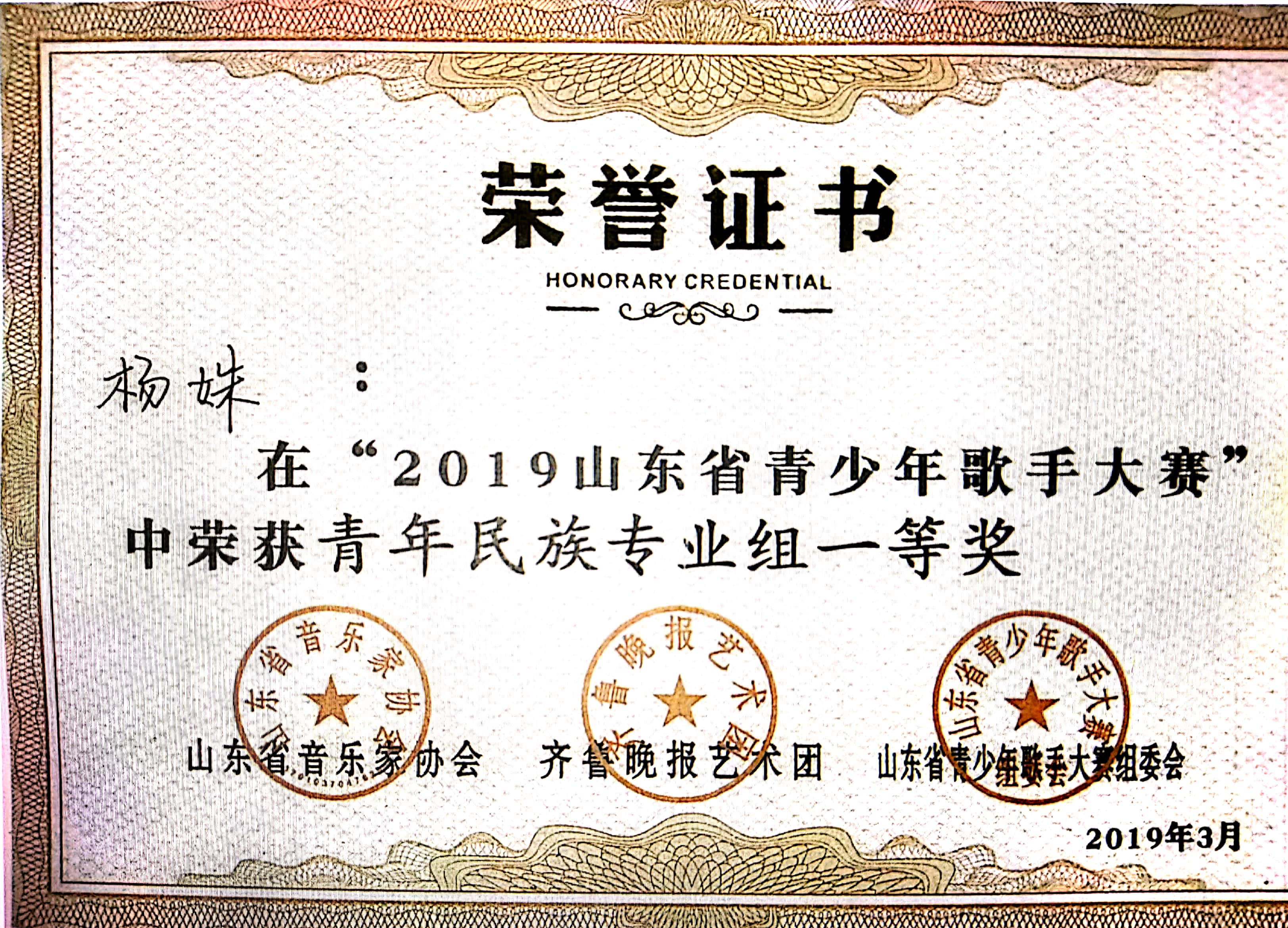 获奖名称:2019山东省青少年歌手大赛