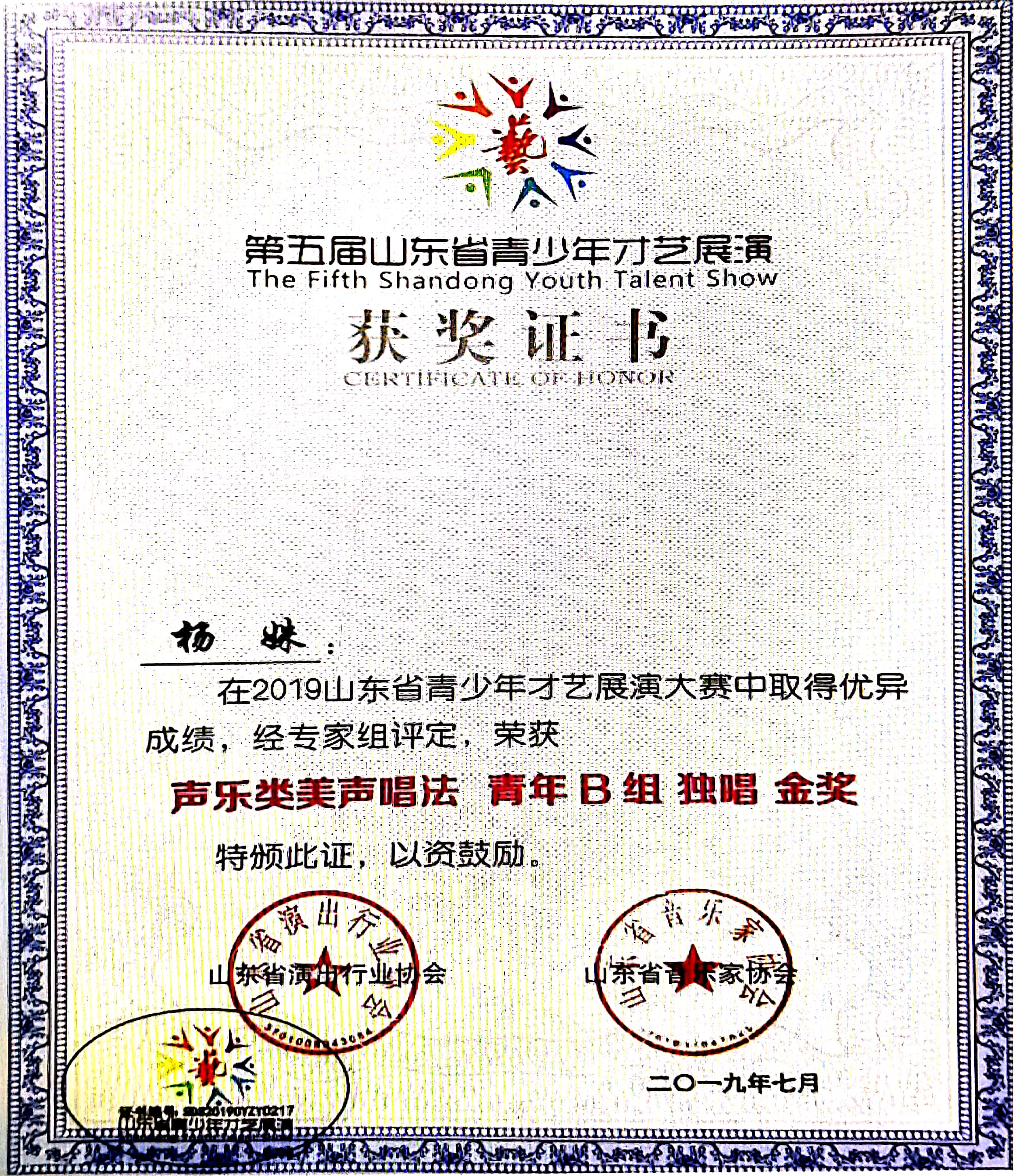 获奖名称:2019第五届山东省青少年才艺展演