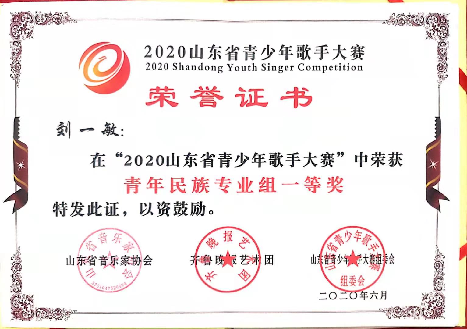 获奖名称:2020山东省青少年歌手大赛