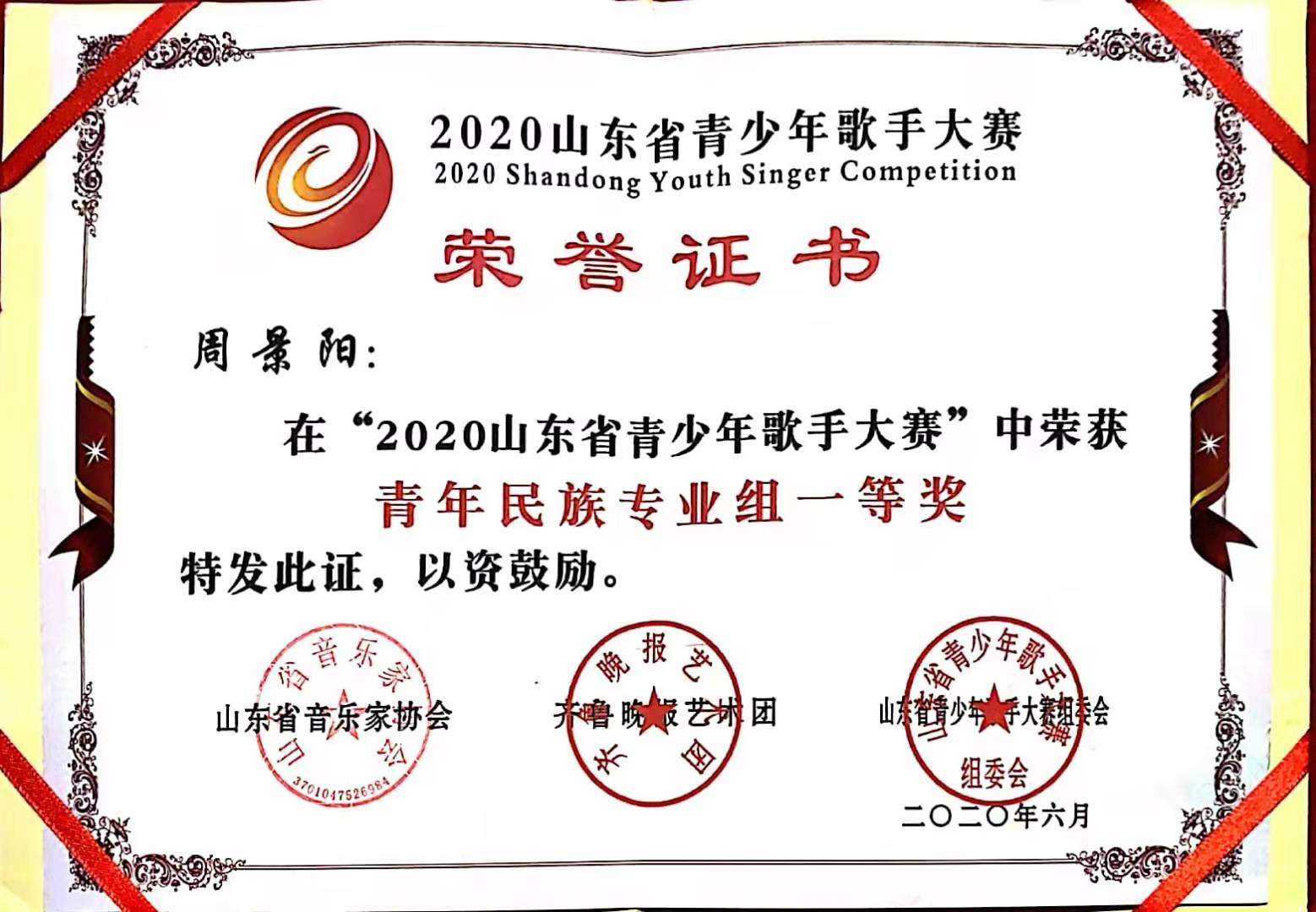 获奖名称:2020山东省青少年歌手大赛