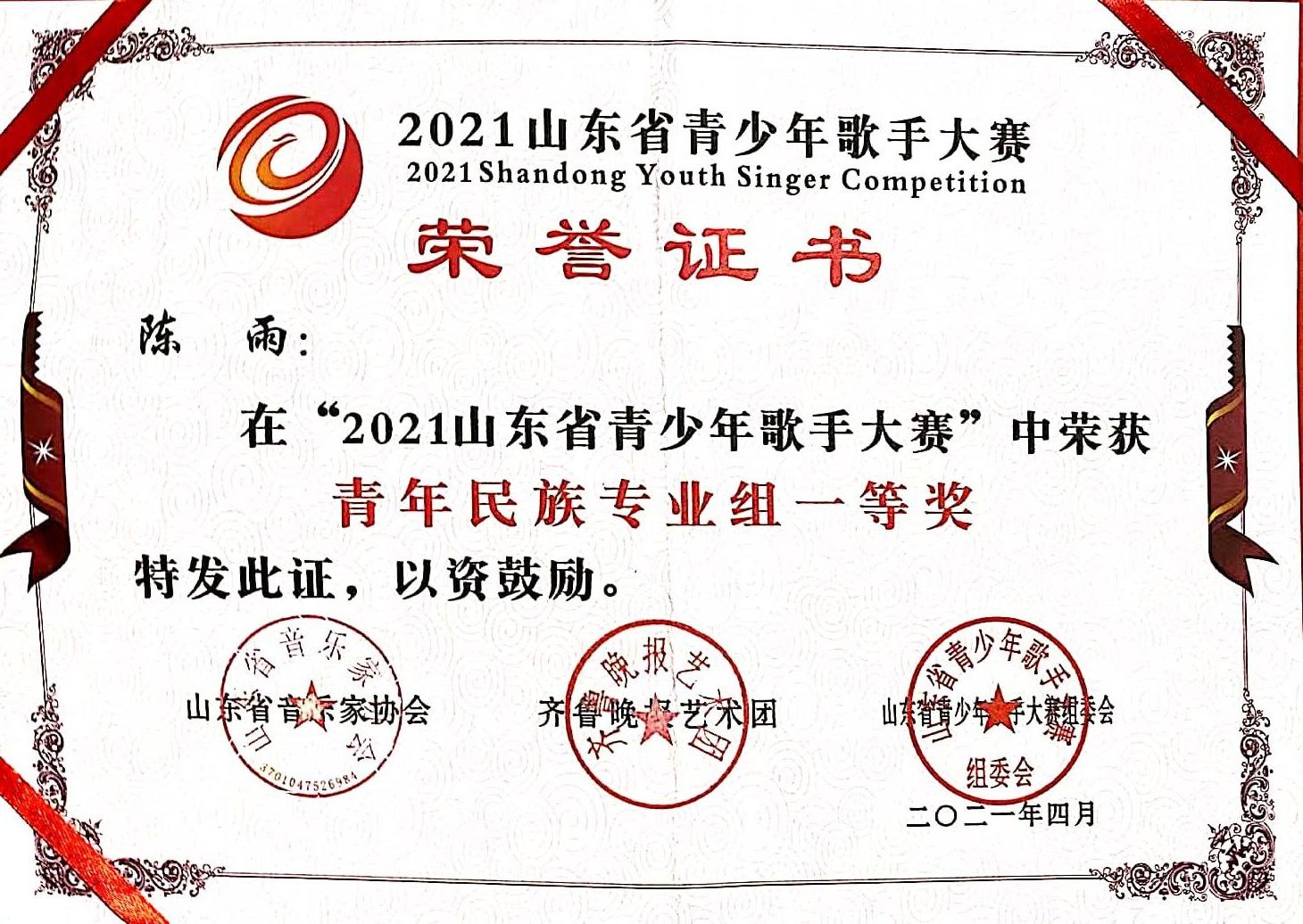 获奖名称:2021山东省青少年歌手大赛