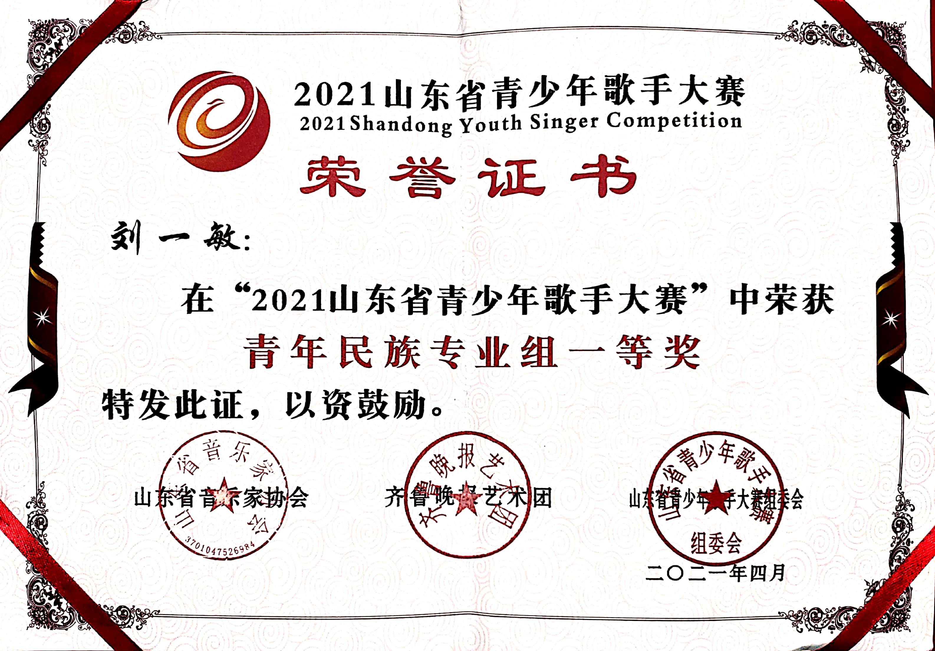 获奖名称:2021山东省青少年歌手大赛
