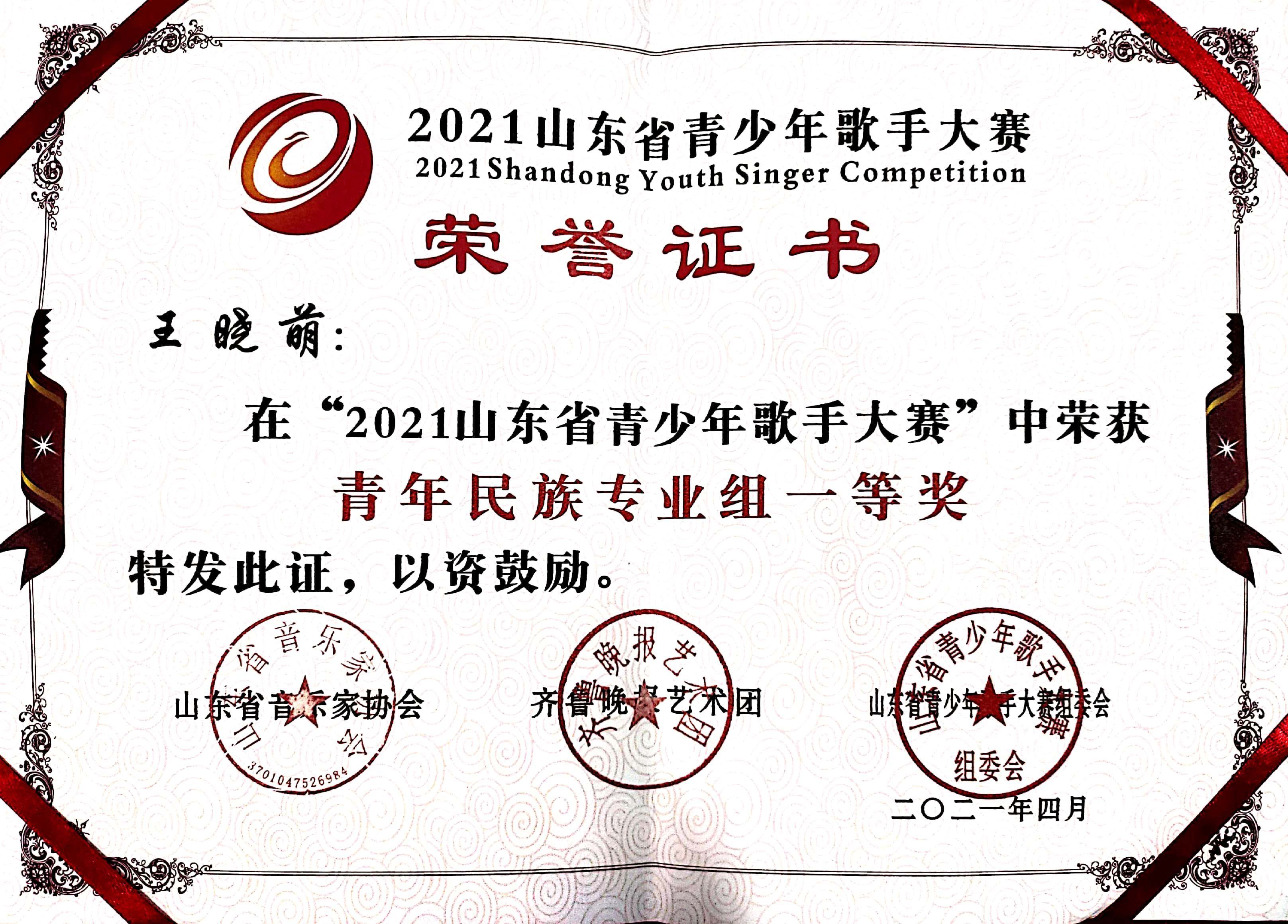 获奖名称:2021山东省青少年歌手大赛
