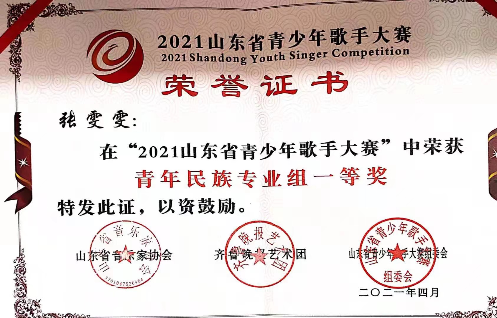 获奖名称:2021山东省青少年歌手大赛
