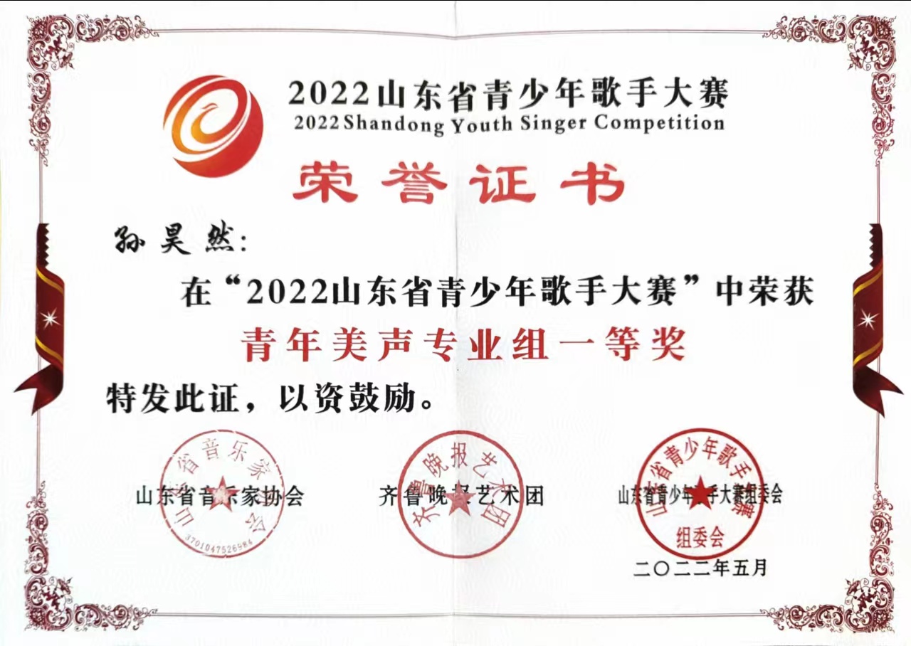 获奖名称:2022山东省青少年歌手大赛