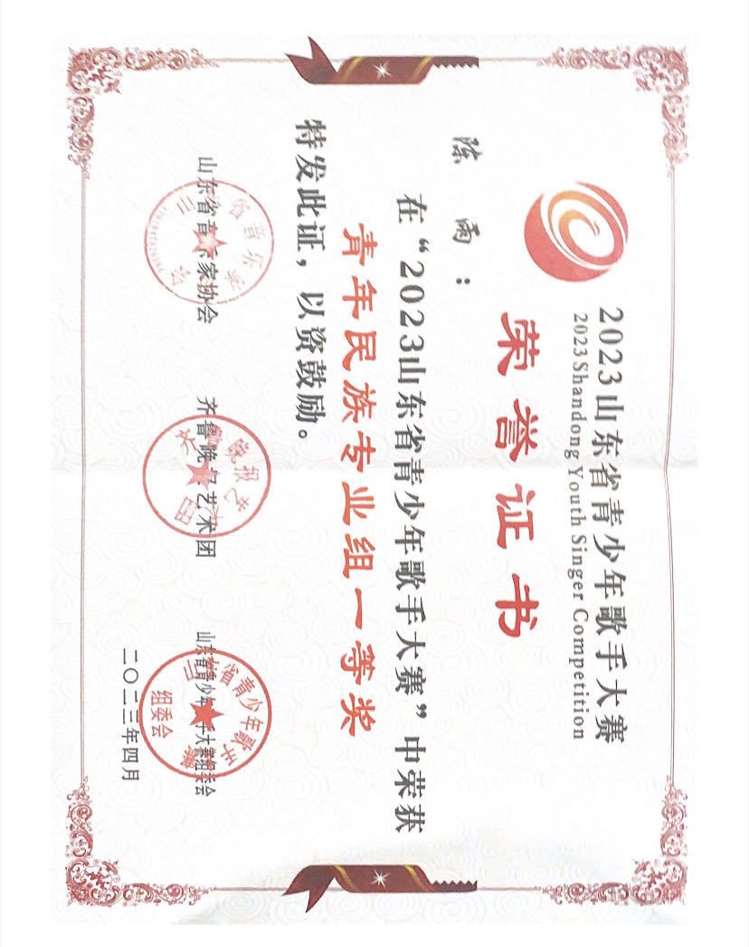 获奖名称:2023山东省青少年歌手大赛