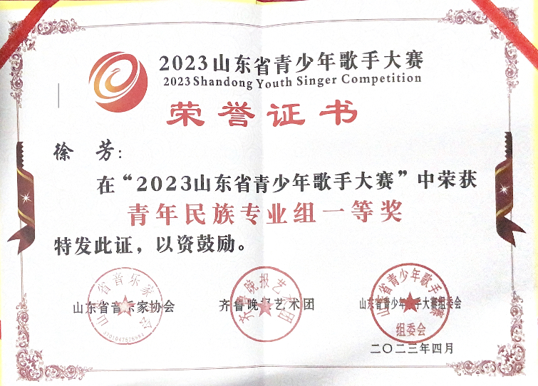 获奖名称:2023山东省青少年歌手大赛
