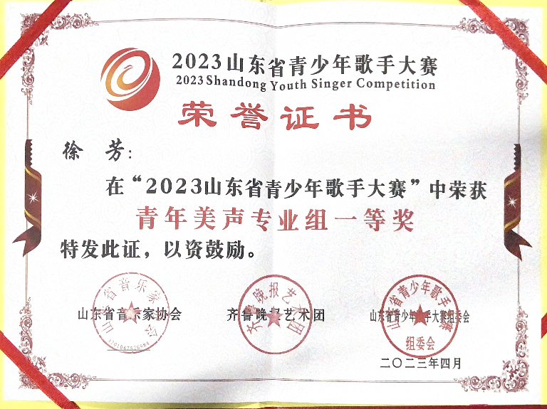 获奖名称:2023山东省青少年歌手大赛民族组一等奖