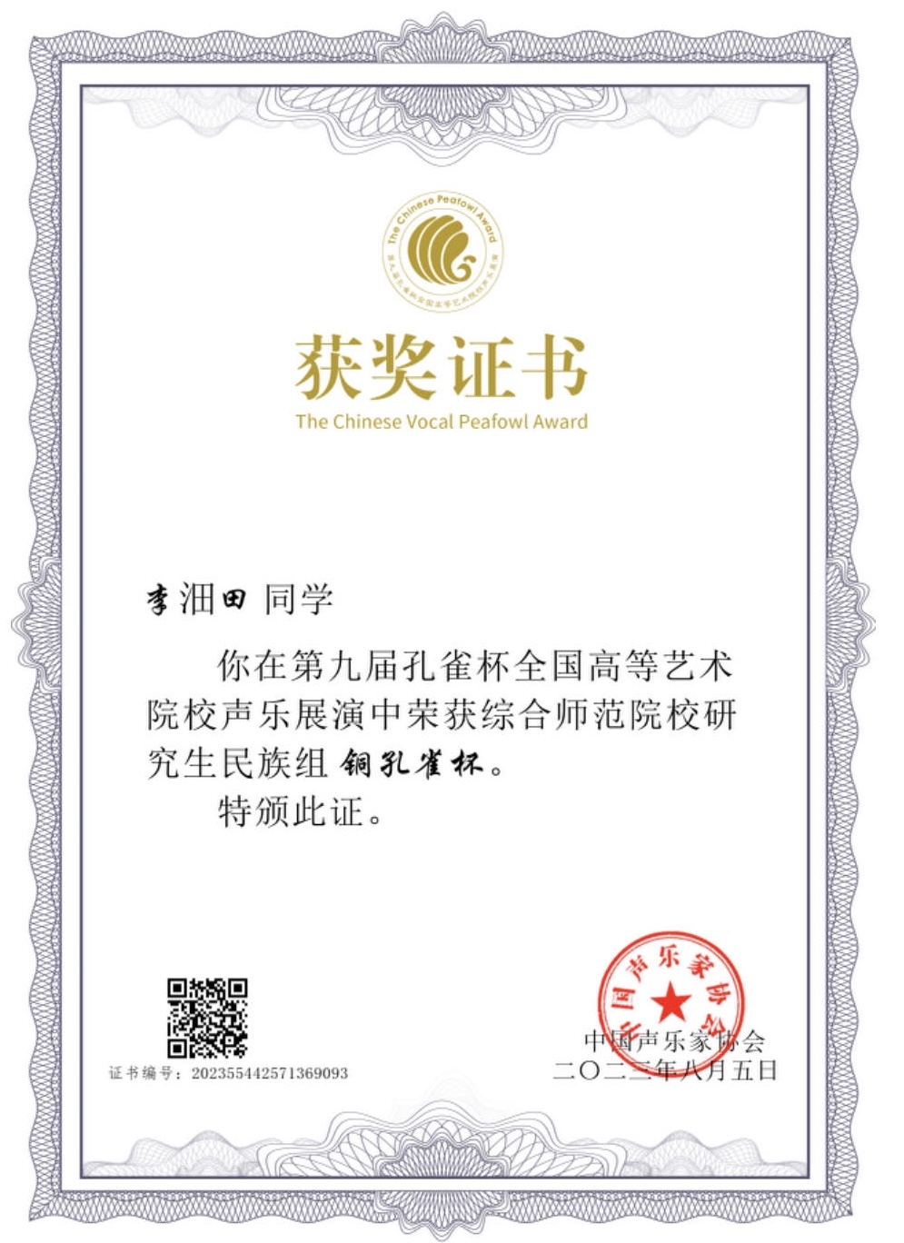 获奖名称:第九届孔雀杯高等艺术院校声乐展演
