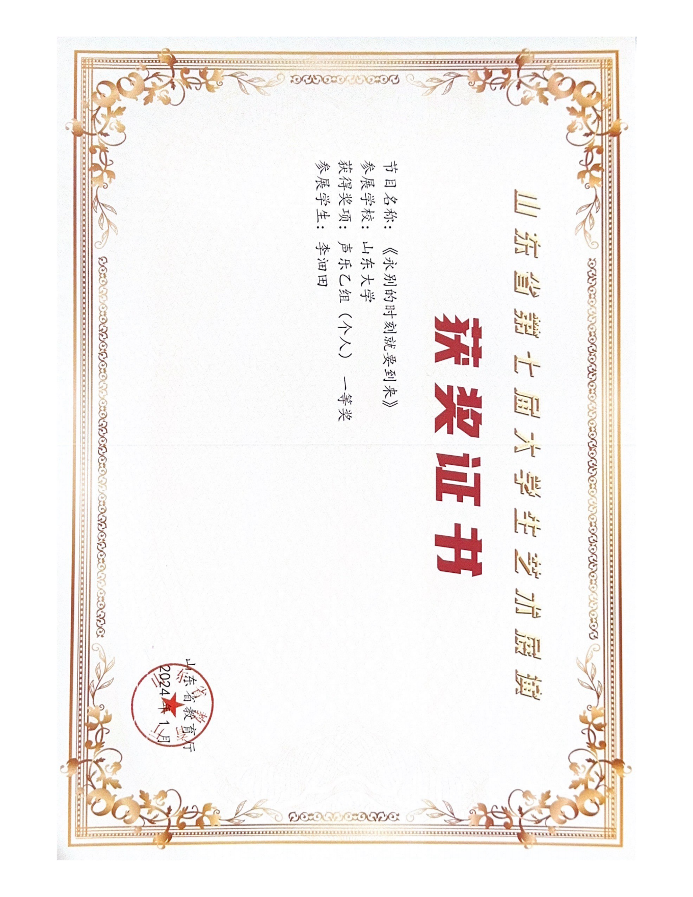 获奖名称:山东省第七届大学生艺术展演