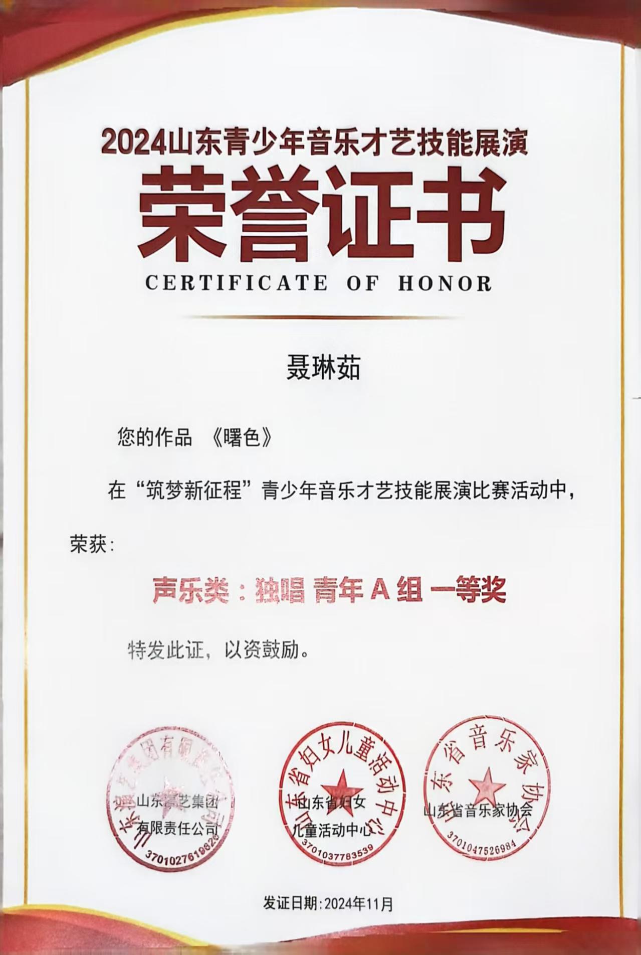 获奖名称:2024山东省筑梦新征程 山东省青少年音乐才艺展演