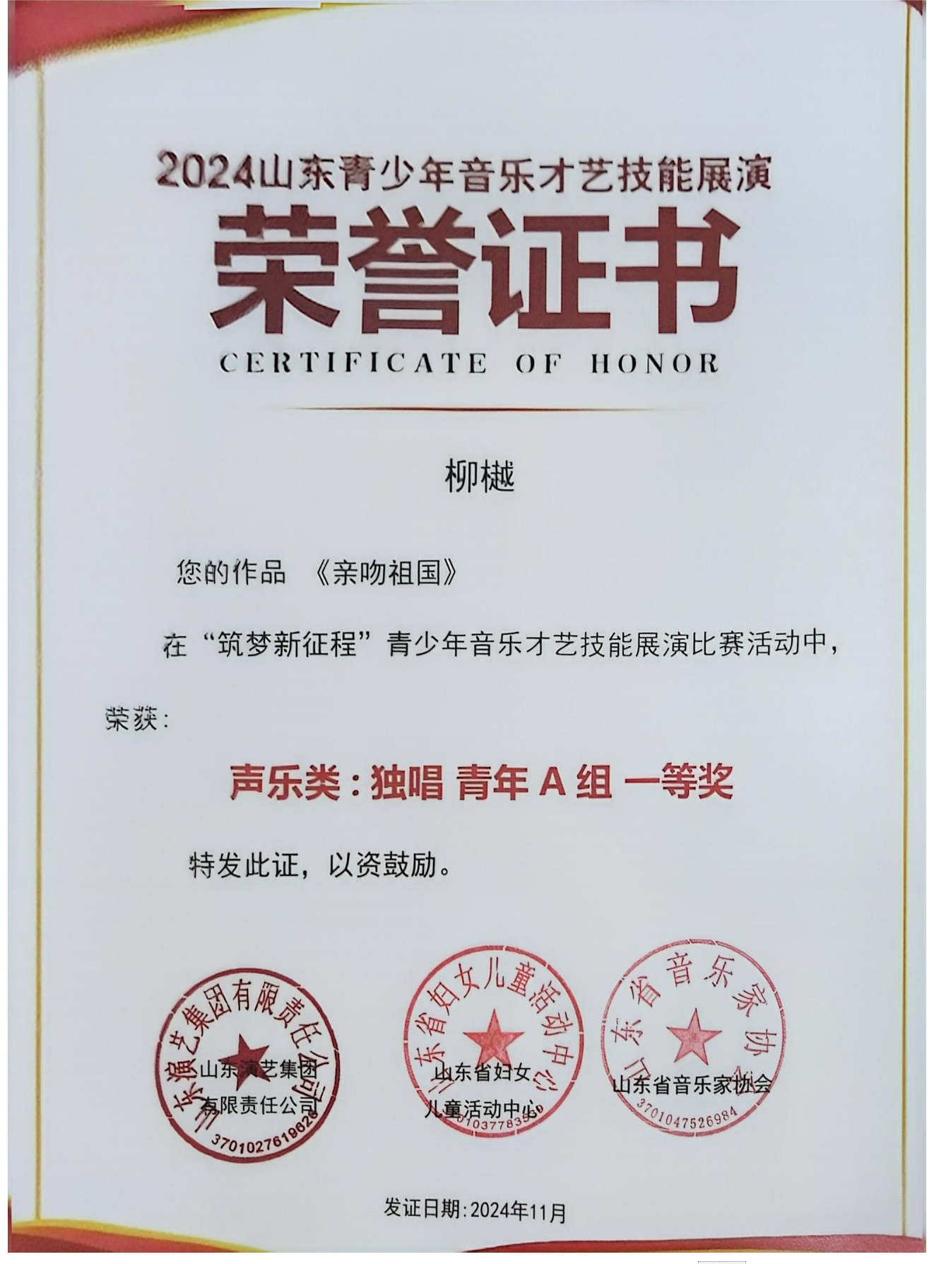 获奖名称:2024山东省筑梦新征程 山东省青少年音乐才艺展演