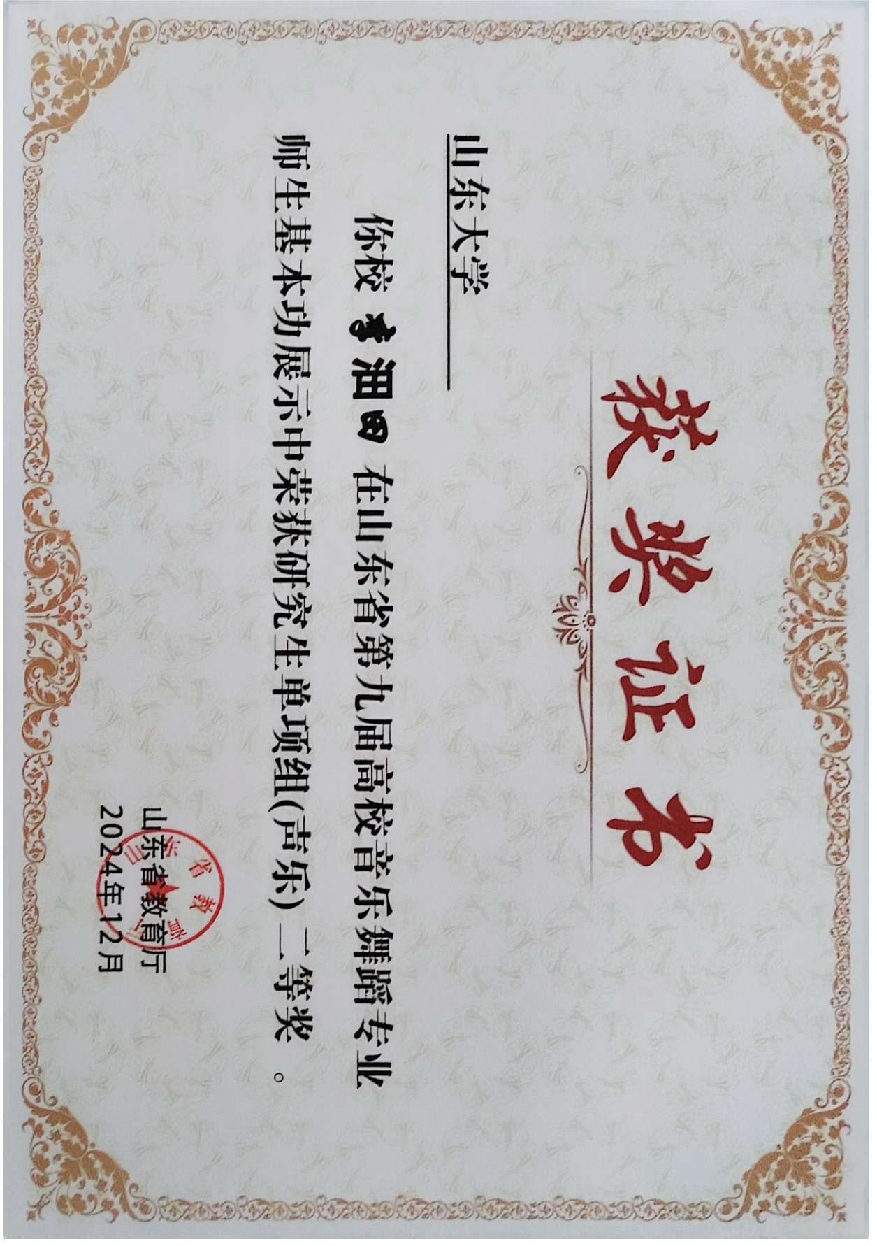 获奖名称:山东省第九届高校音乐舞蹈专业师生基本功展示