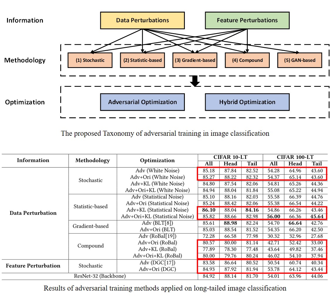 Adversarial training is originated in image classification to address the problem of adversarial attacks, where an invisible perturbation in an image leads to a significant change in model decision. It recently has been observed to be effective in alleviating the long-tailed classification problem, where an imbalanced size of classes makes the model has much lower performance on small classes. However, existing methods typically focus on the methods to generate perturbations for data, while the contributions of different perturbations to long-tailed classification have not been well analyzed. To this end, this paper presents an investigation on the perturbation generation and incorporation components of existing adversarial training methods and proposes a taxonomy that defines these methods using three levels of components, in terms of information, methodology, and optimization. This taxonomy may serve as a design paradigm where an adversarial training algorithm can be created by combining different components in the taxonomy. A comparative study is conducted to verify the influence of each component in long-tailed classification. Experimental results on two benchmarking datasets show that a combination of statistical perturbations and hybrid optimization achieves a promising performance, and the gradient-based method typically improves the performance of both the head and tail classes. More importantly, it is verified that a reasonable combination of the components in our taxonomy may create an algorithm that outperforms the state-of-the-art.