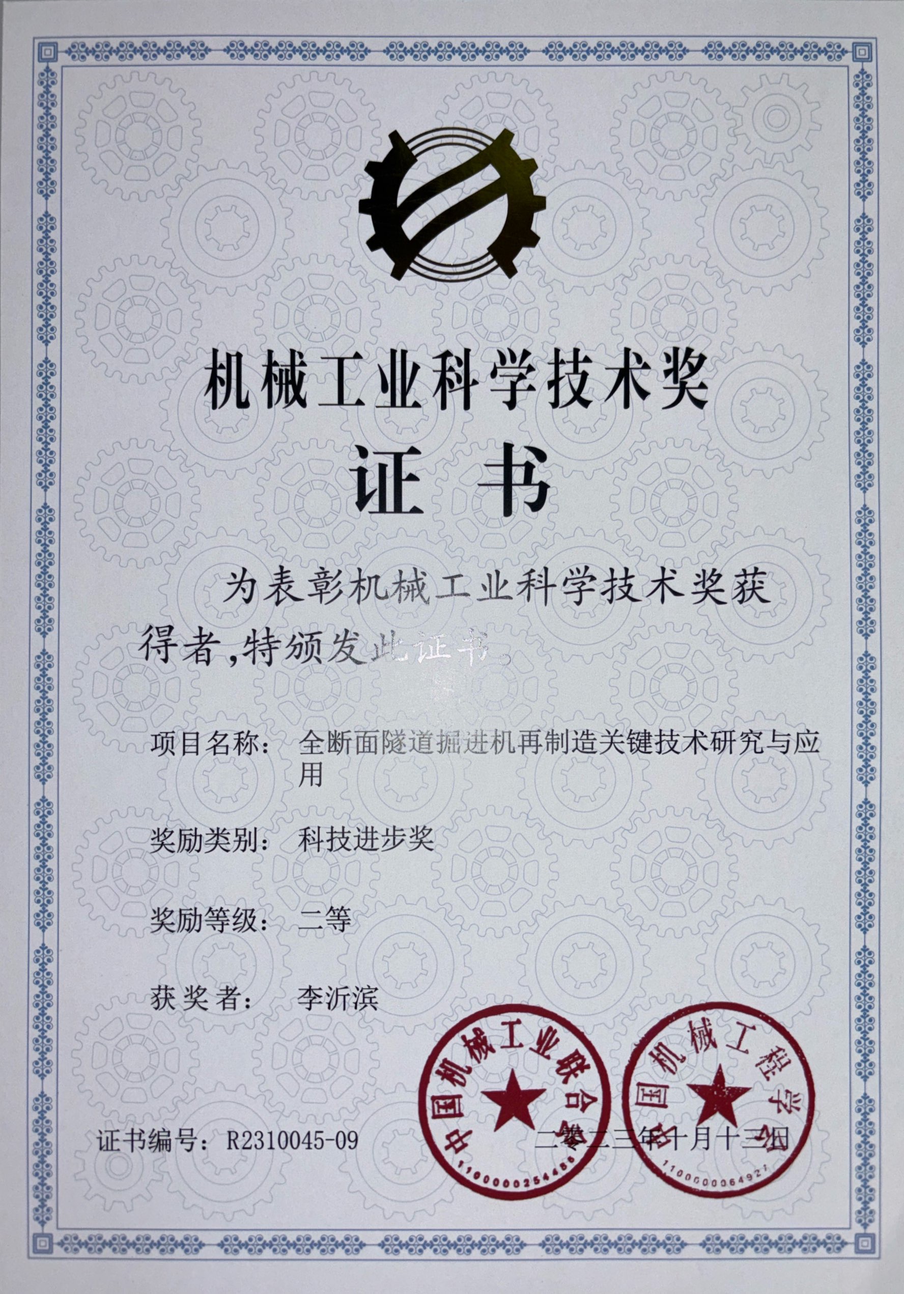 Title of Achievement:全断面隧道掘进机再制造关键技术研究与应用