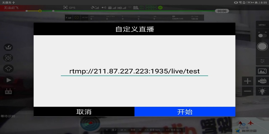 用户在App的图像回传界面点击右侧的“直播”按钮,填写想要推送直播视频的RTMP服务器地址,界面如下: