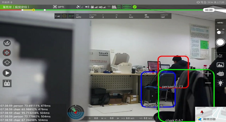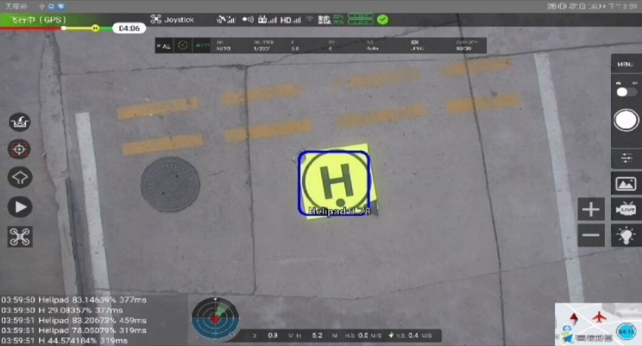 用户选择好降落点后,点击确定,App会自动飞往降落点然后将镜头摆至垂直向下方向,开启停机坪识别线程,开启虚拟摇杆功能,在每次识别过程中计算停机坪偏离图像中心的距离,根据回传图像中停机坪的位置通过虚拟摇杆控制无人机水平移动和下降,调整无人机与停机坪的相对位置,使无人机不断接近停机坪并最终精确降落到停机坪上,降落过程效果图如下: