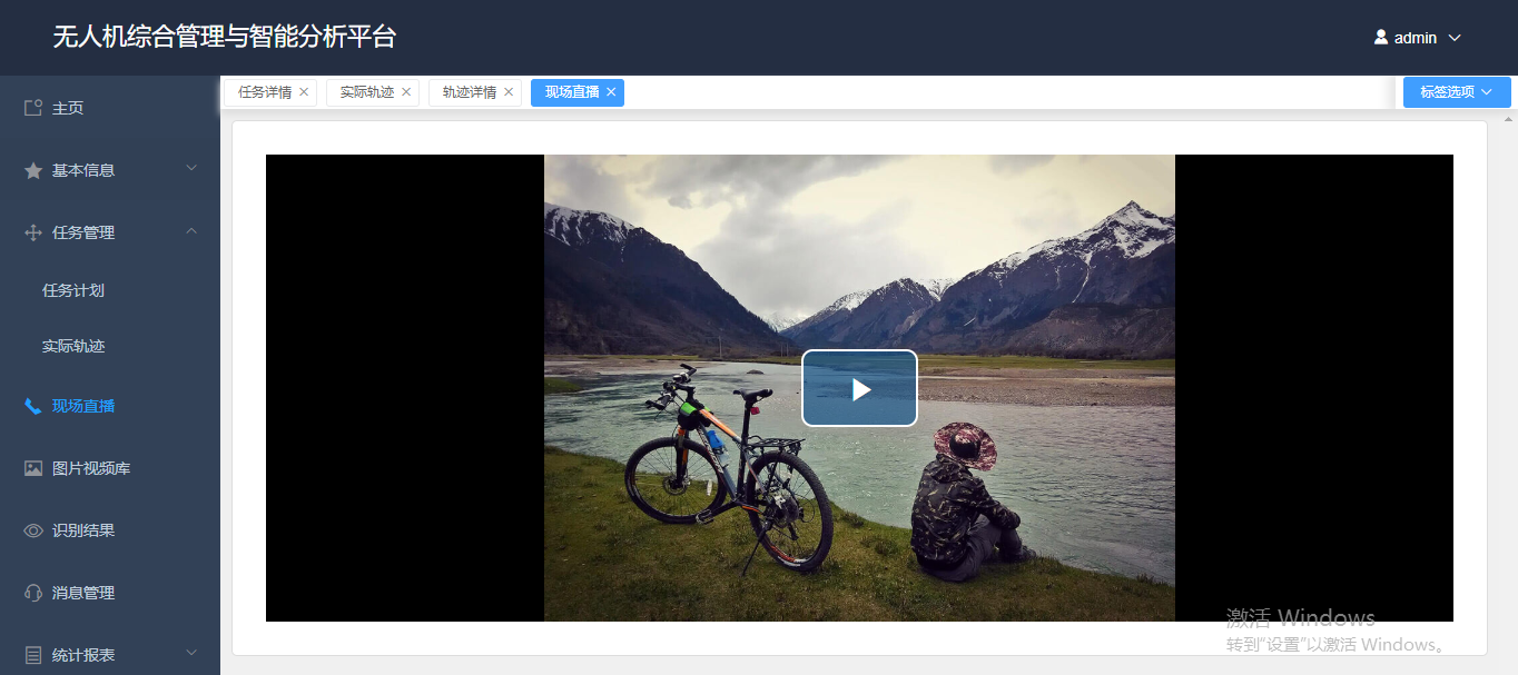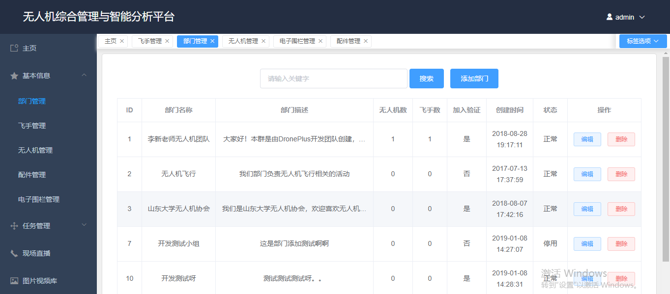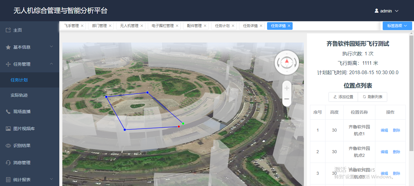 无人机综合管理与智能分析平台包括无人机数据可视化概览、基本信息(部门、飞手、无人机、配件、电子围栏)管理、任务管理、现场直播、识别结果、图片视频库、消息管理、统计报表等功能。