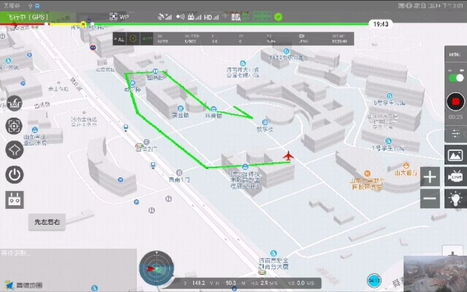在任务列表界面点击“执行”进入系统主界面,点击左侧的“开始”图标可控制无人机执行设定好的飞行任务。无人机在执行任务过程中App会绘制无人机的飞行路线并记录无人机的轨迹数据和飞行状态数据,同时将这些数据实时上传到后台服务器。执行任务界面如下: