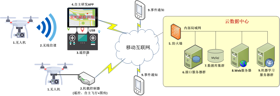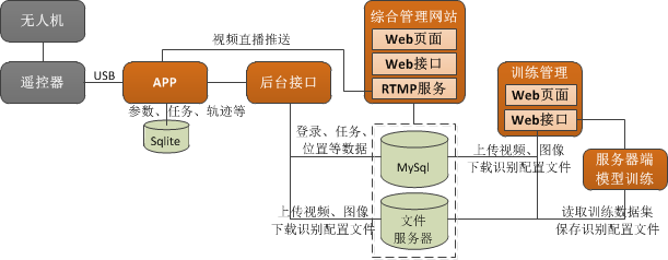 该系统基于大疆无人机开发,可以分为控制无人机飞行的移动端、对各种数据进行综合管理与分析的后台管理系统、机器学习服务集群以及接口服务器。该系统是一个无人机、飞手、任务等进行综合管理并对无人机回传数据进行管理分析的综合平台。
