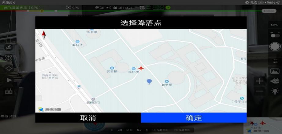 在App的图像回传界面,用户可点击左侧的“ 自动降落”按钮,在弹出的对话框中根据停机坪的位置选择降落点,界面如下: