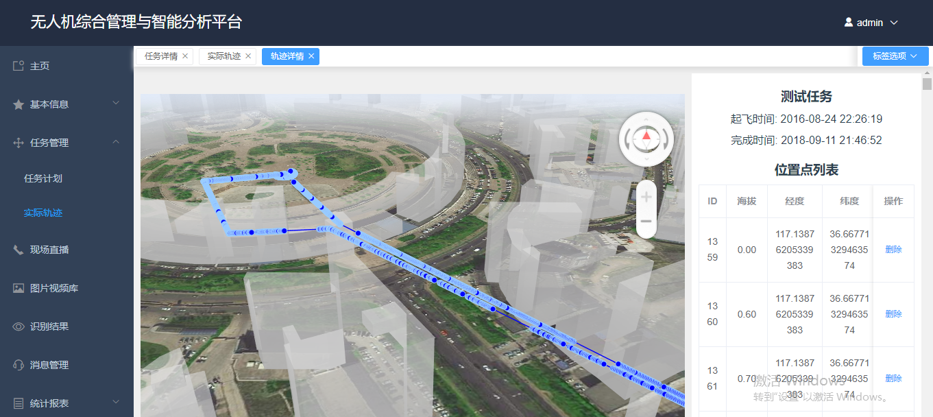 对于无人机的实际飞行轨迹会通过移动端传到服务器,同步到管理系统的实际轨迹列表中,查看实际飞行轨迹的效果如下图所示: