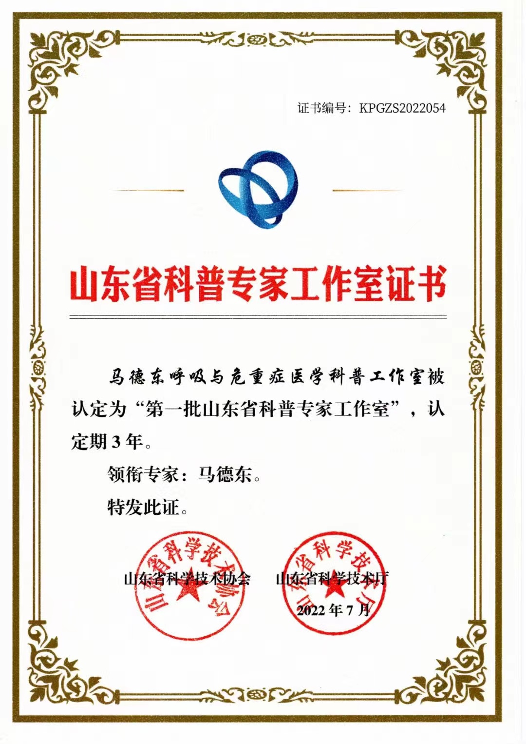 获奖名称:科普示范工程马德东呼吸与危重症医学科普工作室