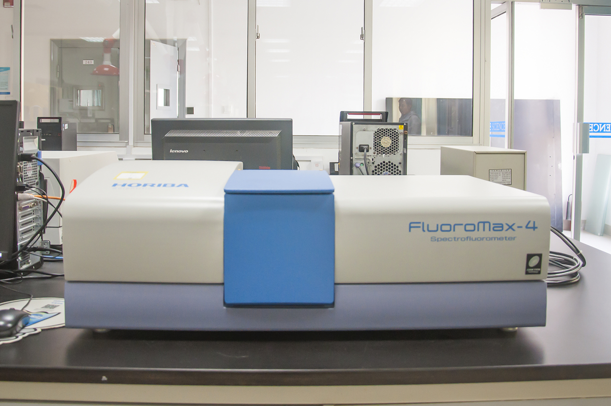 荧光光谱仪(Horiba, FluoroMax-4),可检测液体/固体样品,检测项目包括常规荧光光谱、上转换荧光光谱、偏振荧光、三维荧光光谱(激发-发射-强度)、变温荧光光谱(固体--78~500K,液体--室温~100℃)、量子产率