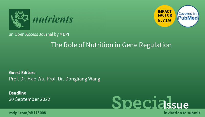 近日,山东大学公共卫生学院吴昊教授与中山大学公共卫生学院王冬亮教授受医学TOP期刊Nutrients(5年影响因子6.352)邀请,联合编辑Special Issue “The Role of Nutrition in Gene Regulation”(营养对基因表达的调控作用)。专刊链接:https://www.mdpi.com/journal/nutrients/special_issues/nutrition_gene