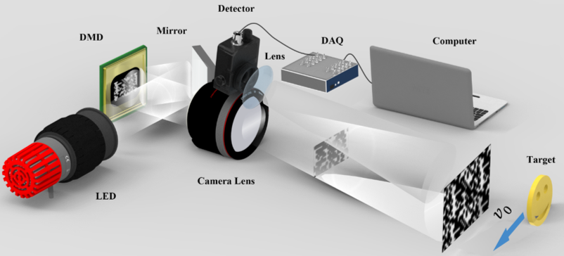 一般超快成像需要借助高速相机实现。借助于压缩感知理论与结构光照明,在空域实现对超高速运动物体的快速成像;在时域实现了对BPSK编码的通信信号亚奈奎斯特(香农定理)采样,有效节约了探测成本。