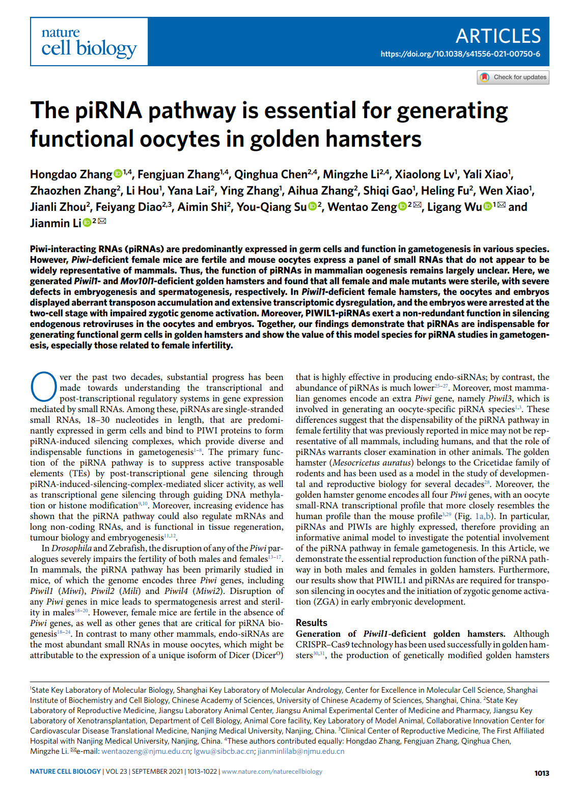 李明哲同学参与李建民教授仓鼠卵母细胞PIWI-piRNA通路作用研究,并以共同一作在Nature Cell Biology 发表颇具新意的论文。