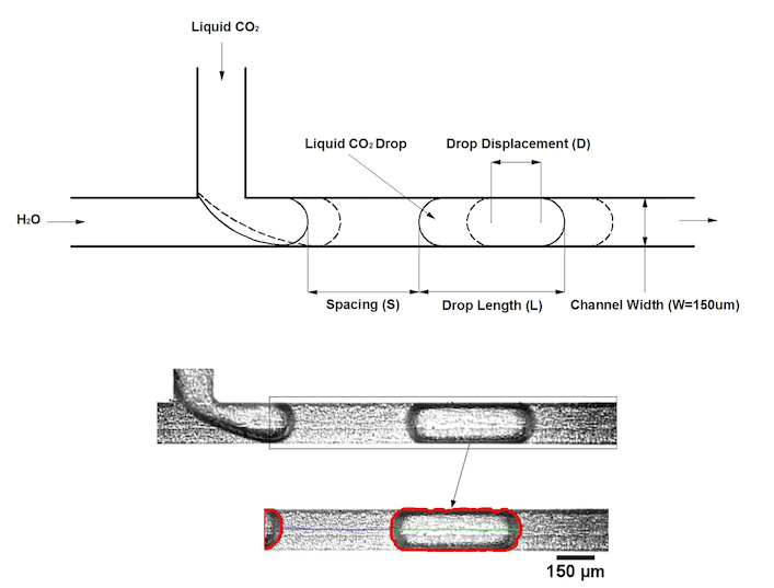 例如,在上图所示的研究例子中,液态CO2自微型T结的侧面通道中流入,在T型结处与在主通道内流动的水相遇,在随时间动态变化的界面压差、粘性力、界面张力的综合作用下,CO2相在一定毛细数(capillary number)的范围内将会成为液滴,并以液滴形式继续往通道下游流动。在什么样的流动条件下CO2会形成液滴,以及流动条件的变化如何影响CO2液滴的尺寸与流动速度,皆是本研究例子中的研究内容。