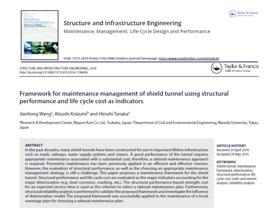 Wang J. H., Koizumi A. and Tanaka H. (2016). Framework for maintenance and management of shield tunnel using strength performance and life-cycle cost as indicators. Structure and Infrastructure Engineering. 13-1,44-54