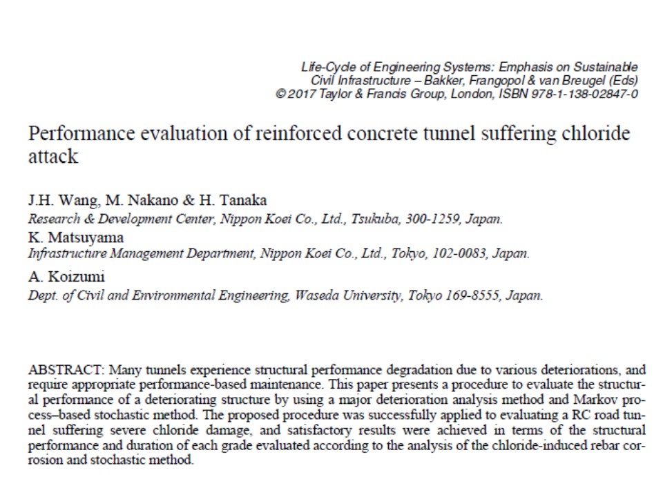 J.H. Wang, M. Nakano, et al.(2016). Performance evaluation of reinforced concrete tunnel suffering chloride attack. The Fifth International Symposium on Life -Cycle Civil Engineering, IALCCE2016, Deft. ( Life-Cycle of Engineering Systems: Emphasis on Sustainable Civil Infrastructure – Bakker, Frangopol & van Breugel (Eds)© 2017 Taylor & Francis Group, London, ISBN 978-1-138-02847-0.