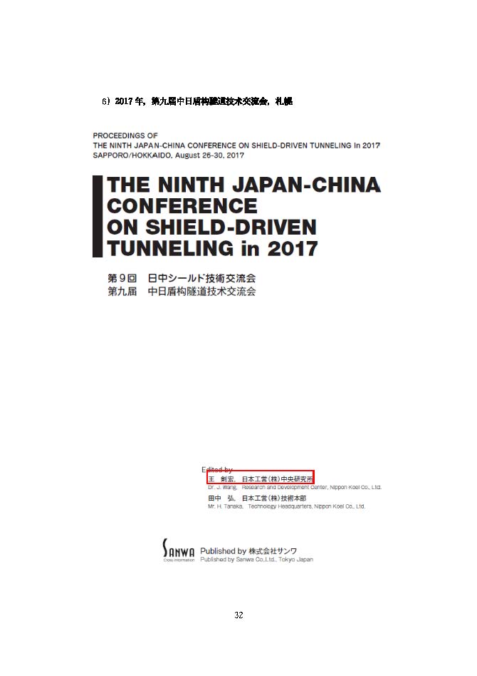 王剣宏,田中弘.第九届中日盾构隧道技术交流会论文集(The ninth China-Japan Conference on Shield Tunneling),ISBN:978-4-9909712-1-2,Sanwa,東京, 2017.8
