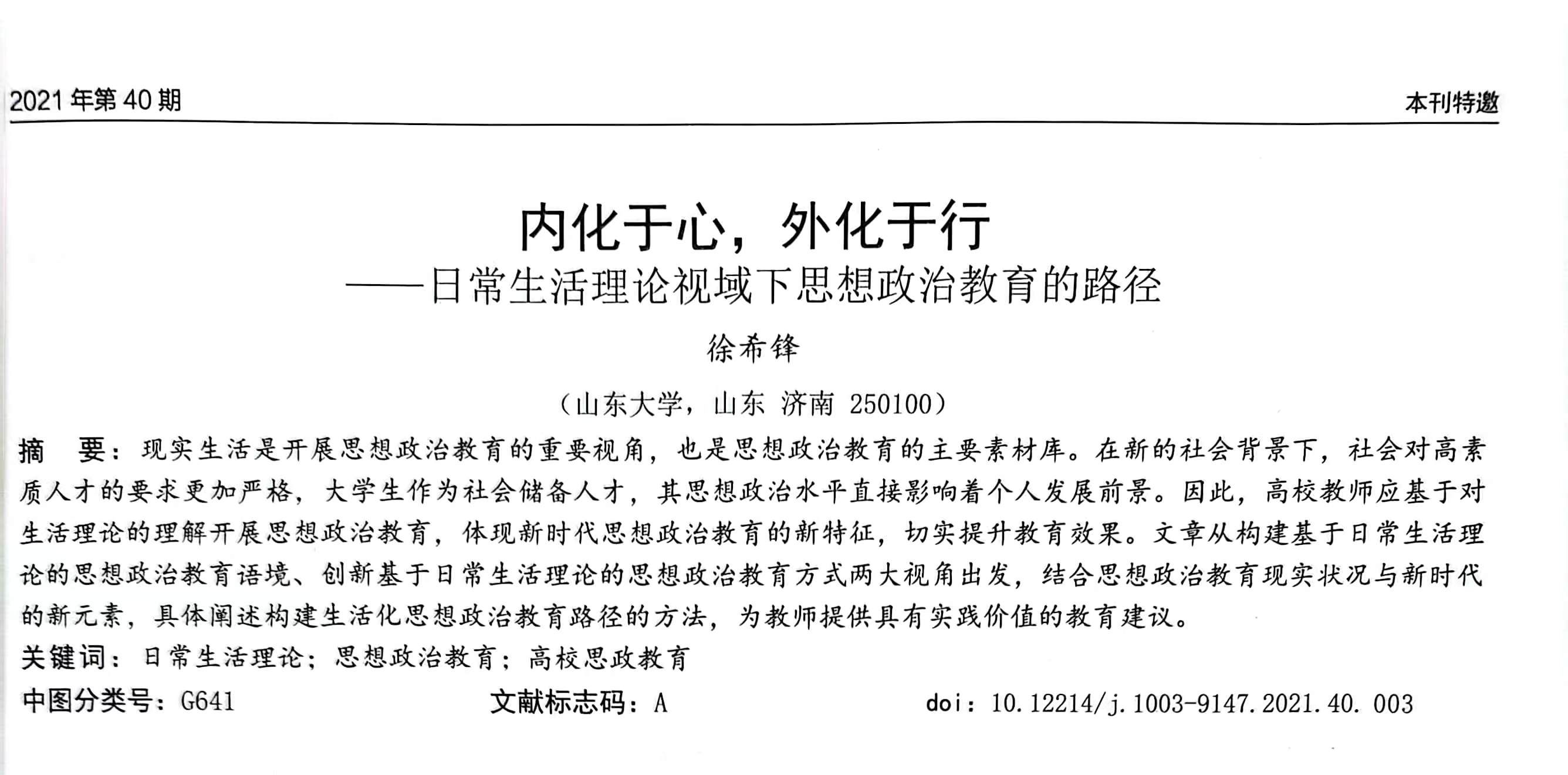 Title of Award : 内化于心,外化于行--日常生活理论视域下思想政治教育的路径