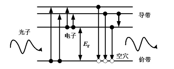 可见光-超紫外波段,入射光子引发电子在不同能级间的跃迁,伴随着光子的吸收或发射。当入射光子的能量ћω大于禁带宽度Eg时,价带内电子将跃迁至导带,并在价带内产生自由移动的空穴。伴随着电子向高能级态激发的同时,高能级态电子向低能级态跃迁,在跃迁过程中将释放光子。