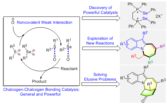 原创性贡献包括:(1) 发现了普适性硫键催化剂,并阐释了其作用机制(Acc. Chem. Res. 2023, 56, 608);(2)建立了了硫属元素相互作用催化 (chalcogen-chalcogen bonding catalysis,原始文献:JACS,2019,141,9175)以及硫属元素和π体系弱作用催化模式(chalcogen···π bonding catalysis,原始文献:ACIE,2021, 60, 9395),把弱作用可活化的有机物拓展到之前无法活化的种类,实现了弱作用活化烯、炔、酯以及醚等,发展了系列新反应,解决了反应性与选择性问题,证明了硫键催化的独特性;(3)验证了碳键催化模式(carbon-bonding catalysis,原始文献:ACIE, 2021, 60, 22717),建立了碳键金属催化策略(carbon-bonding metal catalysis, CBMC,原始文献:JACS, 2023, 145, 21554),证明了碳键弱作用可调控反应性与选择性,这些研究成果拓展了弱作用催化的研究边界。