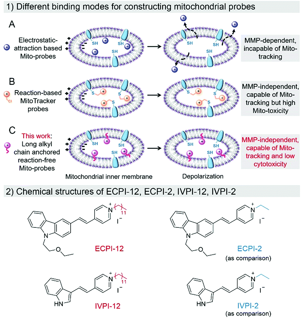 为了证明当线粒体膜电位降低或消失时,是长烷基链的作用使ECPI-12/IVPI-12固定在了线粒体上,作者合成了它们对应的短链分子ECPI-2/IVPI-2,然后将短链分子对细胞染色后进行细胞成像。如Fig. 1C所示,在正常活细胞中,两个短链分子能够染色线粒体。然而,加入CCCP后,ECPI-2的染色图样从花丝状变为在细胞中分布的点状,IVPI-2进入了细胞核并染色了核仁。这一结果表明这两个短链分子在线粒体膜电位降低后不能染色线粒体。需要注意的是,ECPI-12/IVPI-12和对应的ECPI-2/IVPI-2在结构上唯一的不同是吡啶盐端接入的烷基链长度不同。因此,作者得出结论:长烷基链的作用使得ECPI-12/IVPI-12在线粒体膜电位降低时仍能固定在线粒体上。