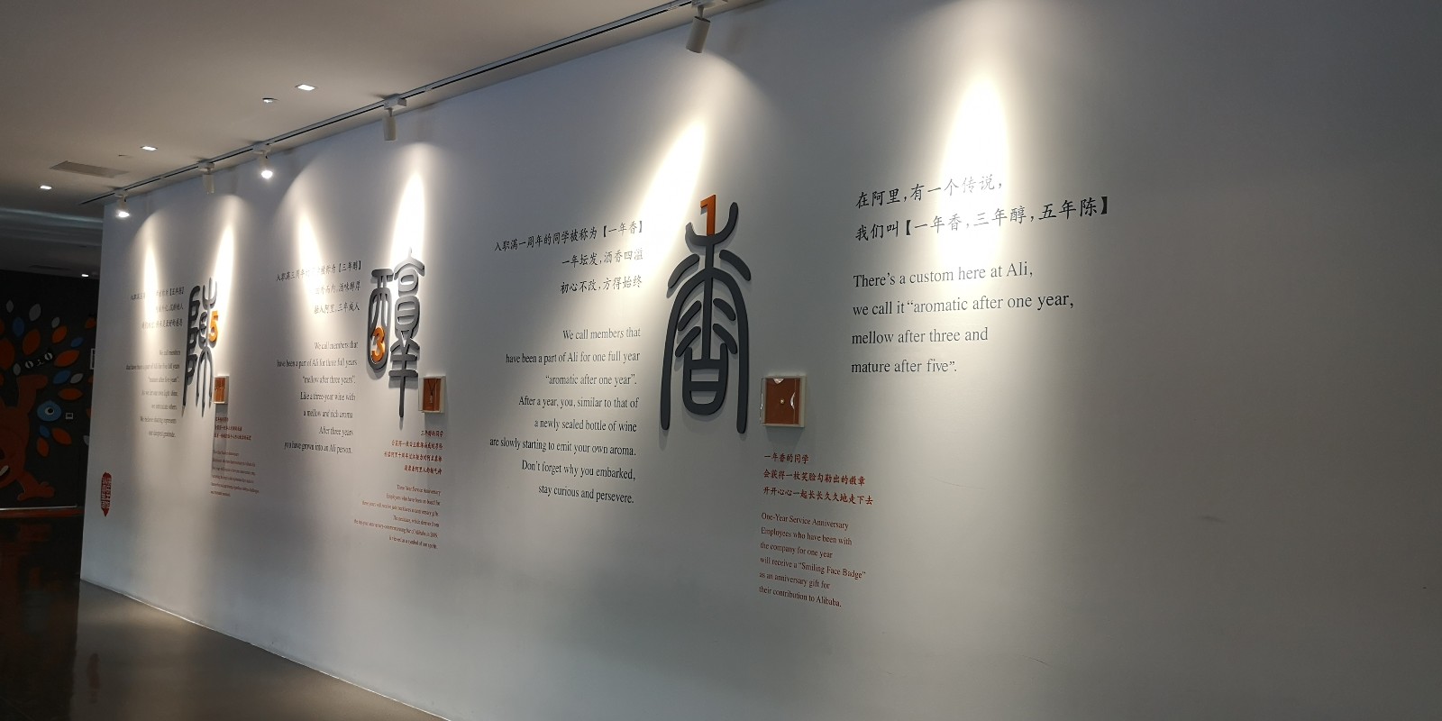 仪式感。现在很多年轻人不喜欢过春节,而喜欢情人节、圣诞节,其中一个重要原因就是年味越来越淡,而西方节日讲究送玫瑰、圣诞礼物等仪式。我高中曾利用暑假到某大型工厂体验过1个月,现在回想起那繁忙的流水线、灰瓦白墙的车间、充满鼻腔的机油味、残破的办公桌、头顶呼呼作响的风扇、每天周而复始的工作……仍是不禁唏嘘,叹一声工人真是不易。相比之下,阿里作为现代企业的典范,不止有着舒适的工作环境,还努力丰富着员工的精神世界。如,每年组织102对公司员工的集体婚礼、5.10阿里日、9.10客户日、换个角度看世界,用各种活动和纪念日给员工以归属感。另外,阿里提出了“一年香、三年醇、五年陈”文化,员工加入满一年举办仪式授阿里铜章,满三年授玉吊坠,满五年授周大福铂金戒指,营造仪式感。