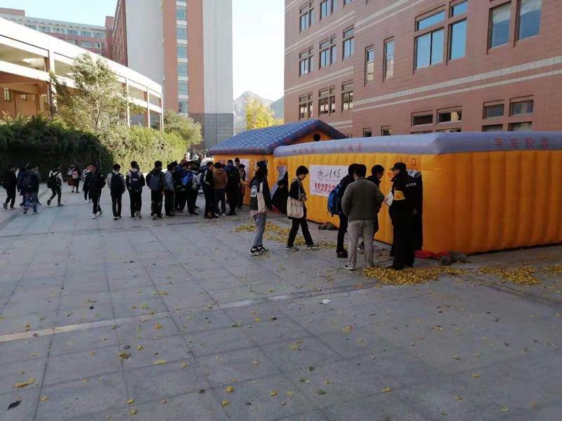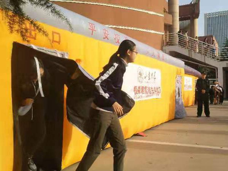 这是学校首次采用消防体验馆方式进行消防宣传教育。体验馆包括模拟烟雾逃生和模拟灭火两个帐篷。逃生帐篷是一个漆黑的密闭空间,内部隔断墙将帐篷分隔成迂回曲折的走道空间,师生在烟雾缭绕的帐篷内能感受火灾发生时的状态,按照帐篷内的安全标识找到正确的道路,才能顺利地从出口“逃生”。模拟灭火帐篷内安装有仿真火焰仪,体验人员通过正确操作仿真灭火器才能成功将模拟火焰熄灭。