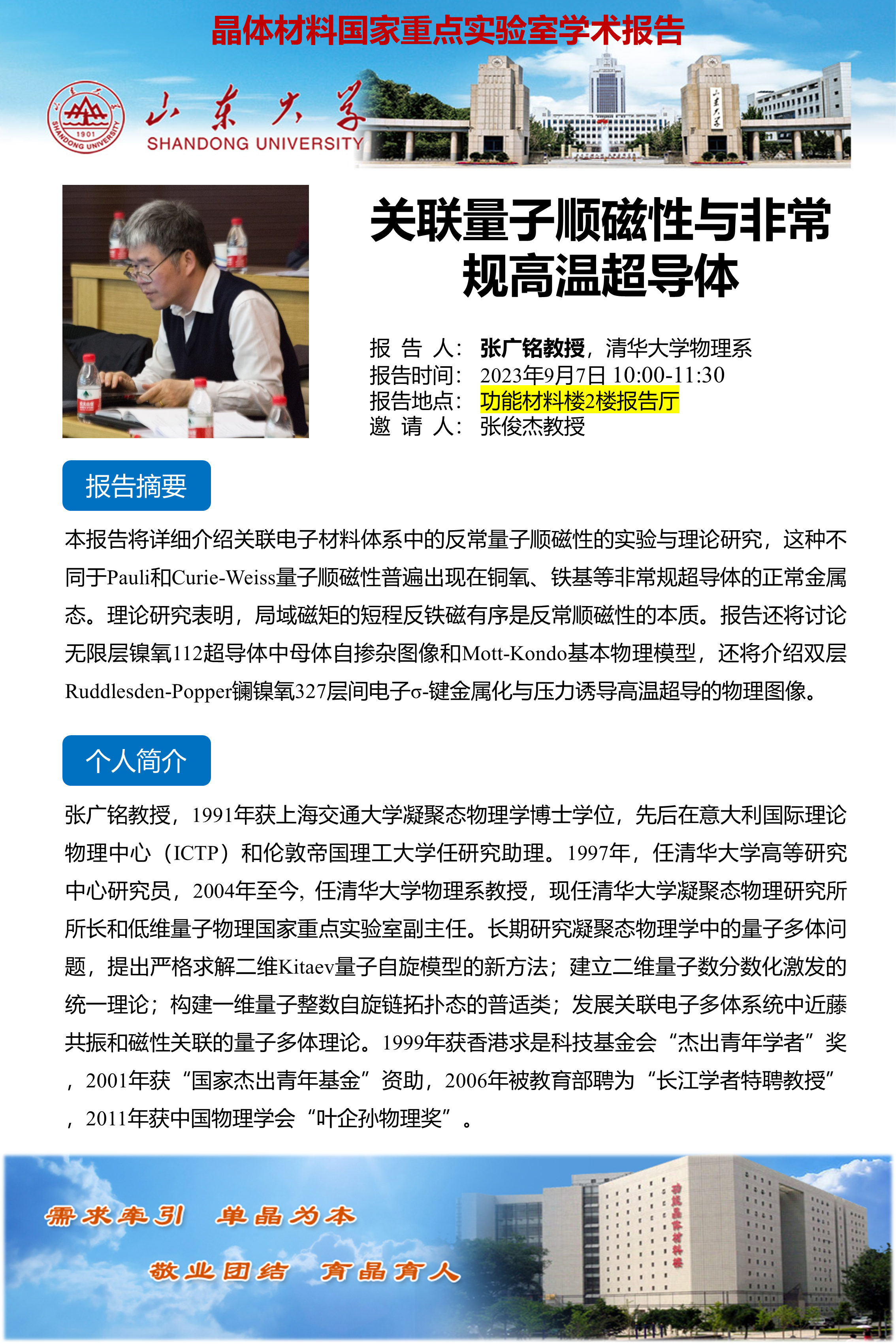 张俊杰教授受邀访问济南大学材料学院并作题为“关联量子材料的设计、单晶生长与调...