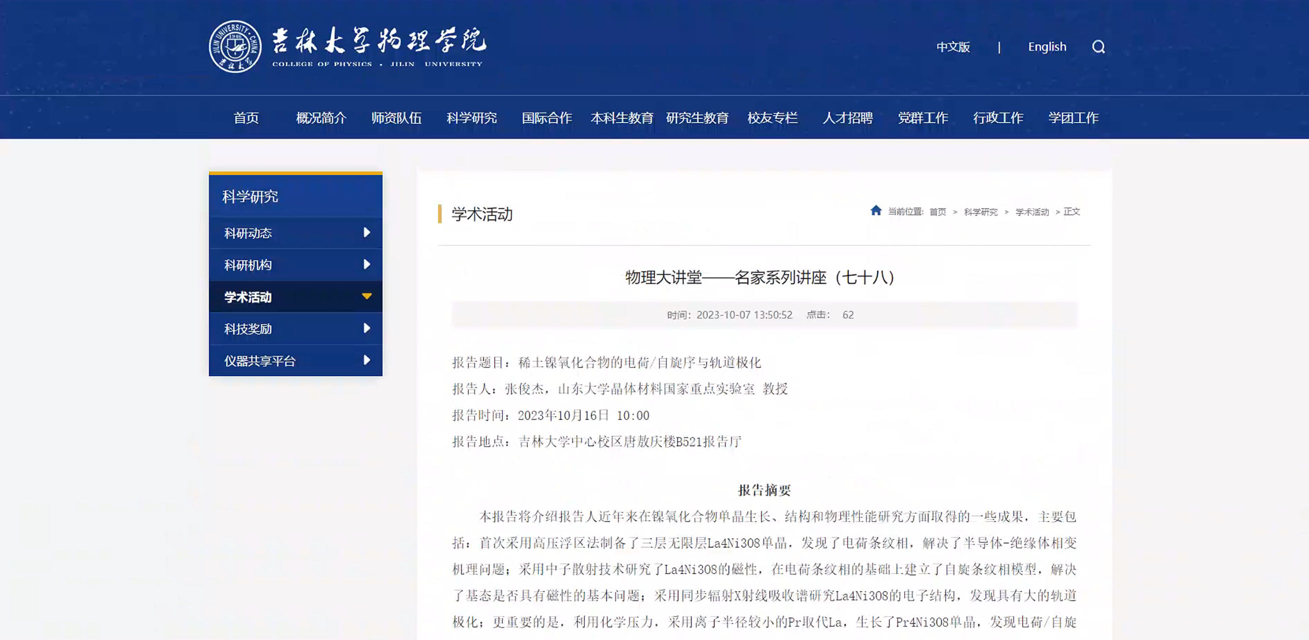 张俊杰教授访问吉林大学物理学院并做题为“稀土镍氧化合物的电荷/自旋序与轨道极化...