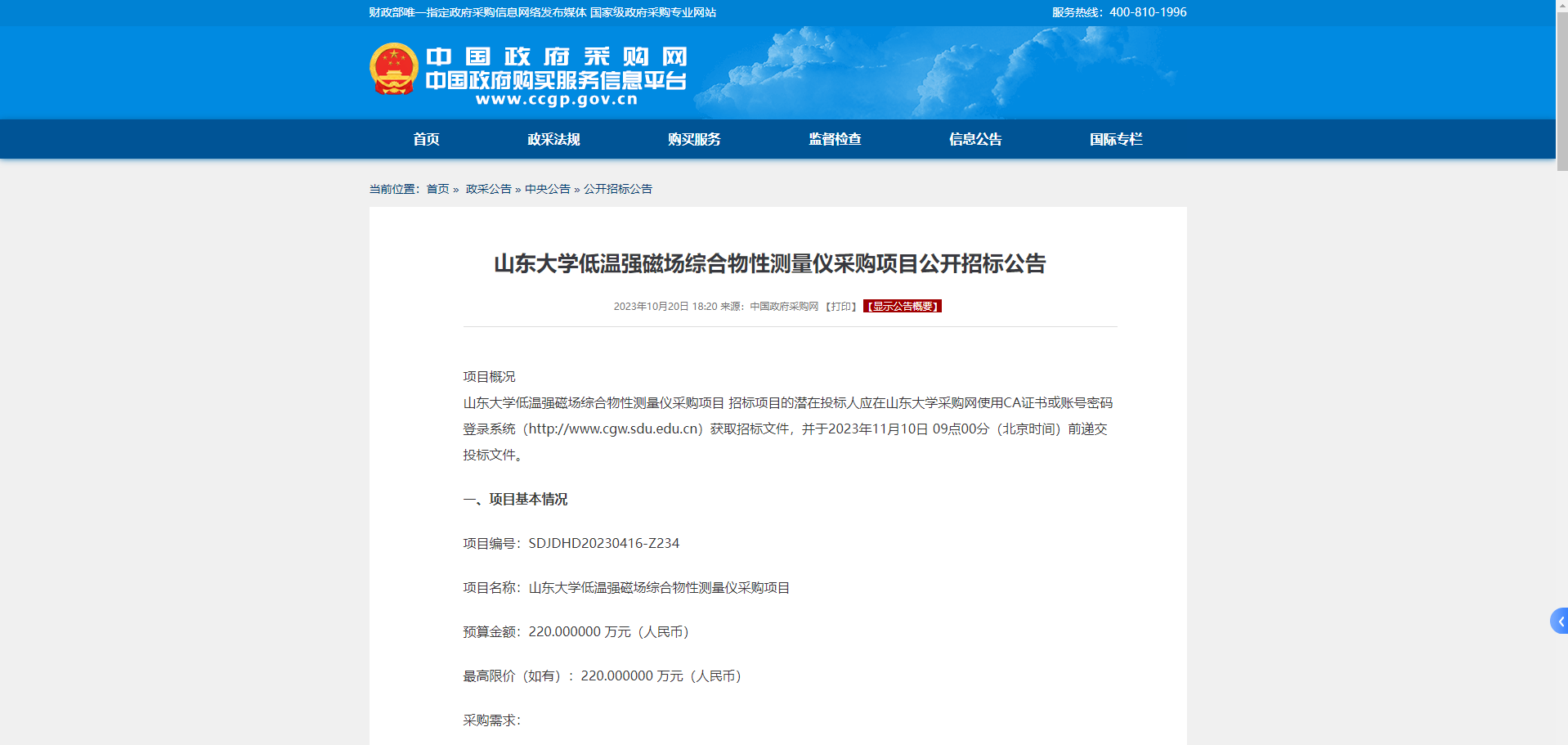 山东大学低温强磁场综合物性测量仪采购项目公开招标公告